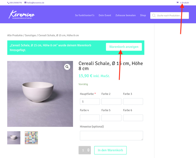 Wenn du alle Artikel in den Warenkorb gelegt hast, klicke auf “Warenkorb anzeigen” direkt über dem Artikelbild oder auf das kleine Warenkorbsymbol ganz oben rechts über dem Hauptmenü unserer Seite.