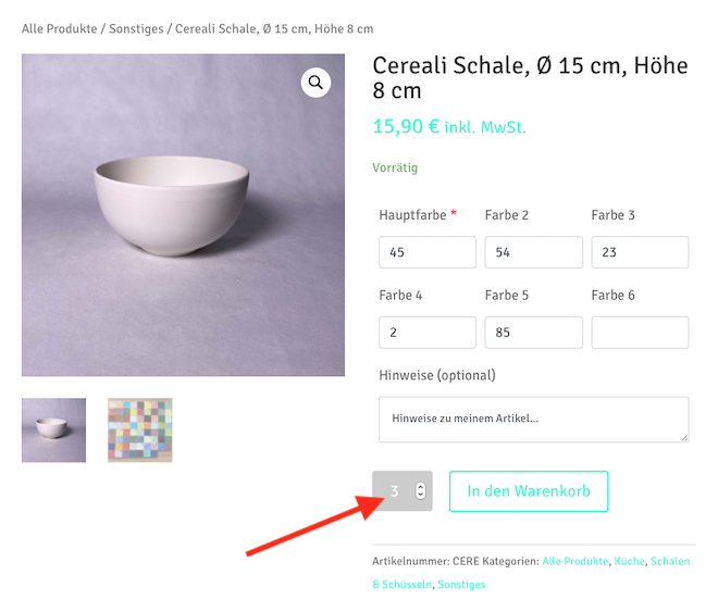 Solltest du einen Artikel mehrfach bestellen und ihn mit den gleichen Farben bemalen wollen, gebe alle Farben einmal an und ändere dann die Anzahl in dem kleinen grauen Feld links neben dem “In den Warenkorb” Button. Wenn du den Artikel zwar mehrmals bestellen willst, aber jedesmal andere Farben benötigst, lege den Artikel jeweils einzeln in den Warenkorb.